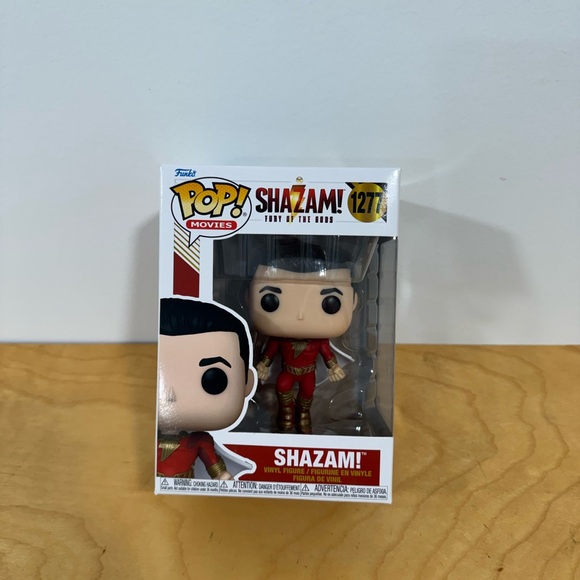 Shazam! figure in vibrant red and gold. Iconic superhero design by Funko.