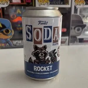Funko Soda collectible can featuring Rocket artwork. Bold blue band with white label and brown accent panels. Eye-catching design for Funko fans and display shelves.