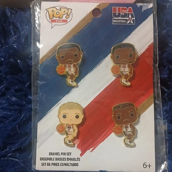 Set of four enamel pins featuring USA Basketball players. Vibrant and detailed designs.