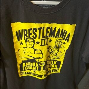 Bold black tee with vibrant yellow WrestleMania III graphic. Features iconic wrestling legends. Perfect for fans. It’s in like new condition