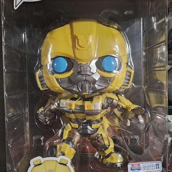 Funko Bumblebee with vibrant yellow and silver design. Features striking blue eyes. Ideal for collectors and fans. In its original box.