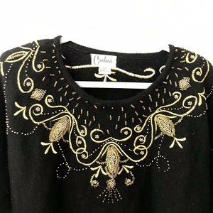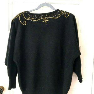 Funky 80s 90s Carducci Black Beaded Angora Blend Pullover Sweater Gold Beading