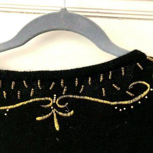 Spectacular, gorgeous, stunning, perfect 80s 90s wool/angora/nylon black pullover sweater with gold beaded round neckline, size M.