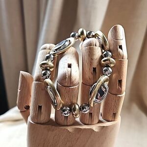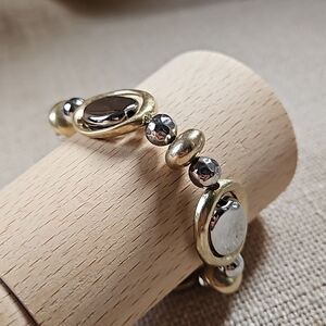 Circle, ovids, rounds... Geometric shiny silvertone and soft goldtone metal bracelet feels luxurious against the skin.