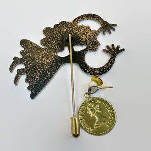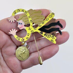 Fun and funky! This is a vintage designer Karen Rossi stick pin brooch. This is called Fanciful Flights. She is an enameled lady flying! She has a dangle that has a faux Queen Elizabeth coin with faux pearls that swings and sways. Great piece that makes you smile!