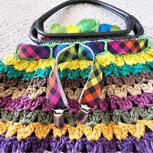 Barely used, if at all; there are flowers on one side of the bag and a colorful set of suspenders woven through the top. Super fun and funky!
