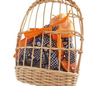 Funky Doll in Wicker Hanging Chair Thumb Sucking Big Eyes Vintage 1960s-1970s Weird & Kinda Creepy