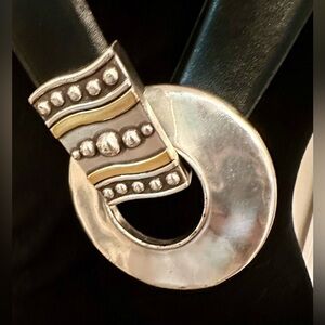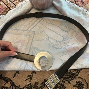 Add an architectural edge to your outfit with this striking black belt featuring a large circular silver-tone buckle and mixed-metal embellishments. The unique closure system—sliding the buckle through the hoop—makes it a functional statement piece with serious Y2K or art deco revival vibes.
