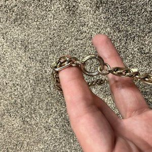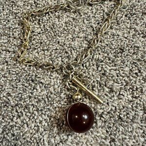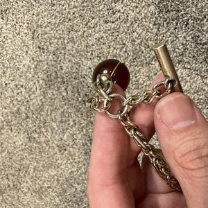 This vintage bracelet is a unique piece of mid-century fashion. The bracelet features a faux tortoise amber color with goldtone metal and a ball closure. The charm bracelet is made of bakelite and plastic material, which adds to its funky and fun style.