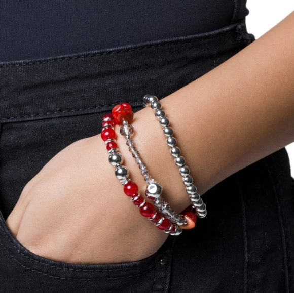 Add a touch of elegance to your outfit with this stunning red and silver beaded bracelet set. Perfect for any occasion.