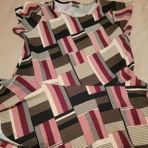 This shirt is an exciting, eye catching pattern in various shades of red, gray, and tan. To add to the fun, the hem is a peplum style, coming to an obvious waist and then flaring out. It's especially flattering on busty women!