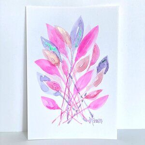 This bright whimsical leaf painting in pink, purple and blue with a sparkle surprise is painted on artist’s watercolor paper for years of viewing enjoyment.