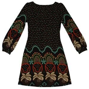 Funky People,boho dress,mini dress,long sleeve,polka dot,floral border,retro print,A-line,stretch knit,scoop neck,festival,fall winter,party,casual,size L
