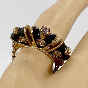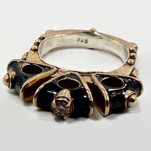 What a unique ring this is! This is a vintage, sterling silver ring with gold vermeil and black enamel. I have never come across one like this before! It is a bit contemporary meets steampunk or machine age! I just wish I could have gotten better photos of it as they do not do this justice. The bottom of the ring is done in a unique shape. Raised dots gives it a machinist nod. A thin link of black enamel runs around the ring inside the outer layers. The top of the ring has triangular shapes that are enameled and accented with cut out holes and more metal dots. The middle one has a prong set crystal. Definitely a cool piece for you!