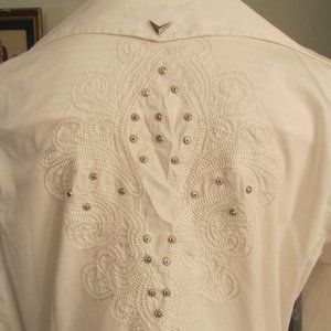 Button down funky rocker Fender shirt by Rock & Roll Religion, embroider Fleur de Lis, long sleeves with satin under cuff.