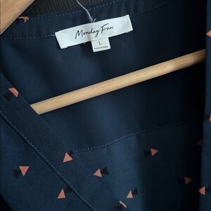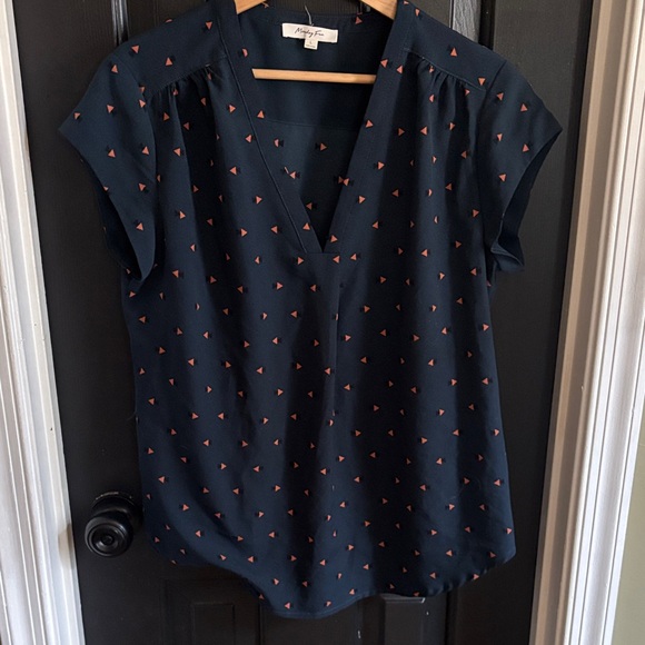 This top reminds me of the 90s. Short sleeve. Blue background with coral and navy triangle shapes all over. Worn once. From Stitch Fox box.