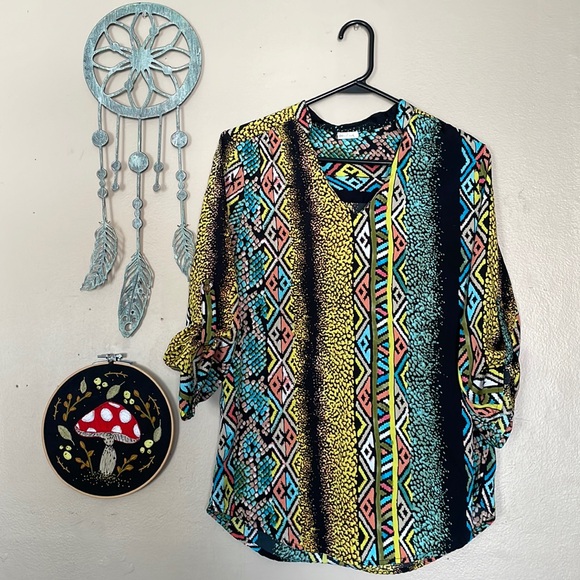 Super lightweight and comfortable! Amazing preloved condition! Silky feel and the sleeves roll up and button. I think the size on the tag says large but fits more like a medium.