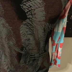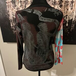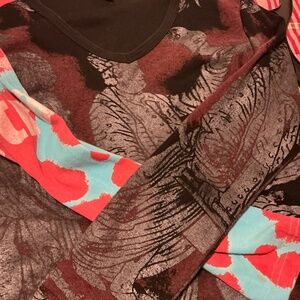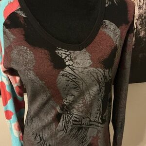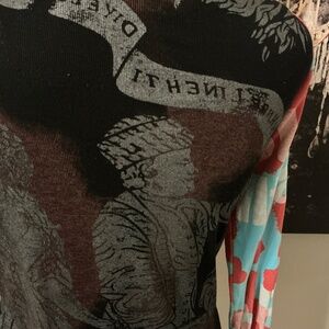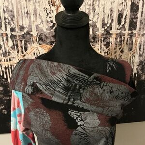 I purchased this super cool top at a boutique in South Korea. It has a very cool Asian vibe! One of a kind. Nonsmoking environment. Fast shipping. Size small.