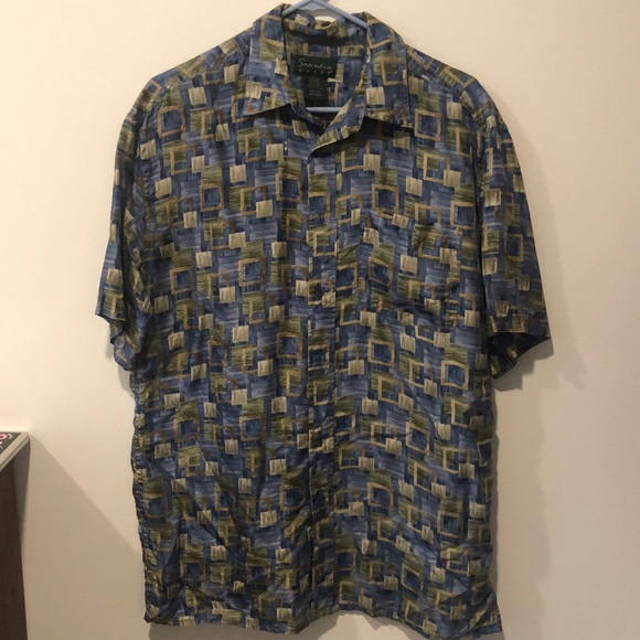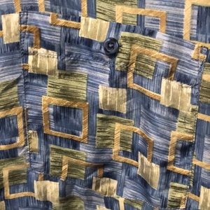 100% silk, vintage Scandia Woods top. Medium but fits big like a Large. Very cool retro pattern that shimmers almost, very flowy, would look great on you going out with some side leg chinos.