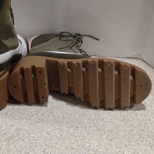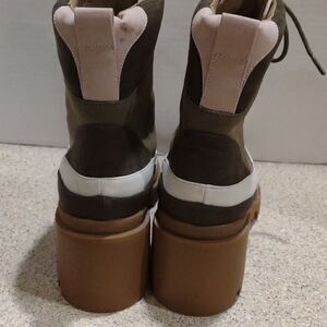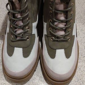 Olive green, pale pink, and off white, Vegan Boots in like new condition. Rugged sturdy boots.