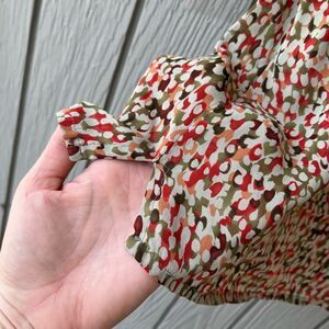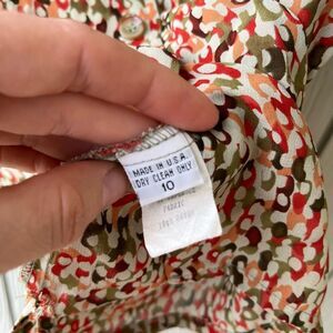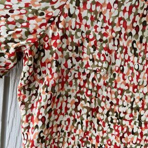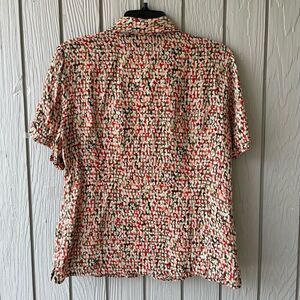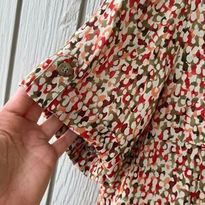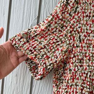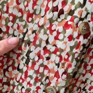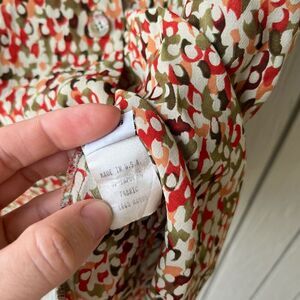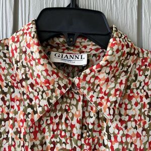 Turn heads in this unapologetically retro vintage blouse by GIANNI — a swirl of reds, olives, oranges, and creams in a wild abstract print that’s somewhere between jungle camo and abstract art. Made in the USA from feather-light rayon, it floats over the body and feels as cool as it looks.