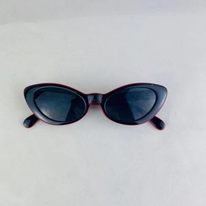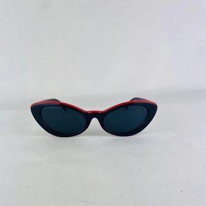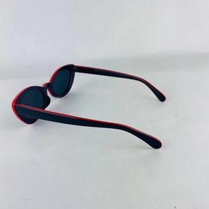Funky cat eye sunglasses with black frame and red rim. Black lens Steampunk. Oculus.
