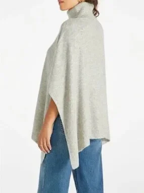 Cozy light gray turtleneck poncho sweater with relaxed drape. Soft knit fabric for all-day comfort. Easy pull-on style that layers beautifully. Versatile light gray color pairs with jeans or leggings.