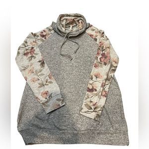 Super cute tunic with funnel neck, flowered sleeves, and a front kangaroo pocket