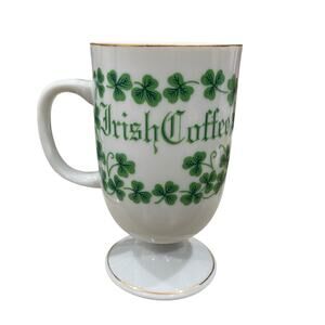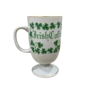 Add a touch of Irish charm to your coffee routine with this delightful vintage mug! This funny 1970s Shamrock Irish Coffee Mug features a lucky clover design, a crisp white porcelain body, and elegant gold trim. It's the perfect way to enjoy your favorite Irish coffee or any hot beverage.