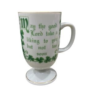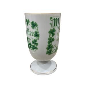 Funny 1970s Shamrock Irish Coffee Mug Lucky Clover White Porcelain Cup Gold Trim