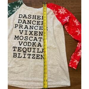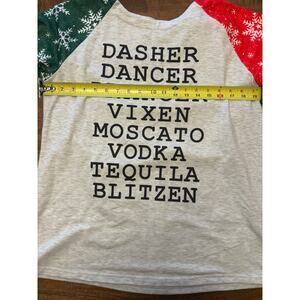 Christmas shirt, holiday humor tee, novelty reindeer shirt, women’s Christmas top, ugly Christmas shirt, funny alcohol shirt, booze reindeer tee, wine lover gift, vodka tequila moscato shirt, festive snowflake sleeve top, unbranded XL Christmas shirt, party shirt, holiday drink theme top, holiday graphic tee