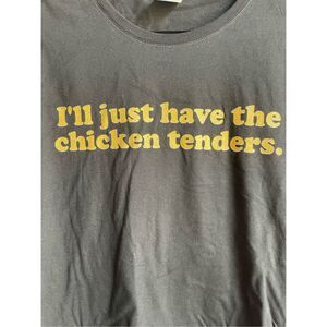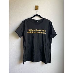 Women’s short sleeve black t-shirt with a bold yellow text graphic that reads “I’ll just have the chicken tenders.” Soft cotton feel with a relaxed fit and crew neckline. Fun and quirky design, perfect for casual wear or gifting to your favorite picky eater. Gently worn with no major flaws. Please see photos for measurements.