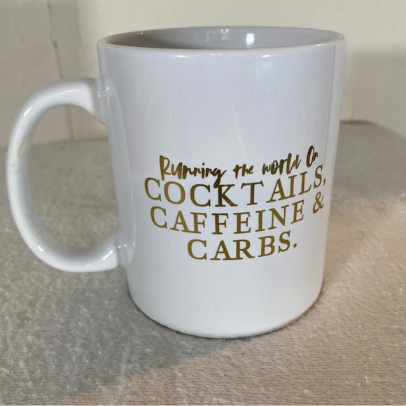 White mug with gold lettering that says Running the World on Cocktails, Caffeine, and Carbs. Great condition! Fun motivational inspirational friendship gift for Christmas this holiday season!