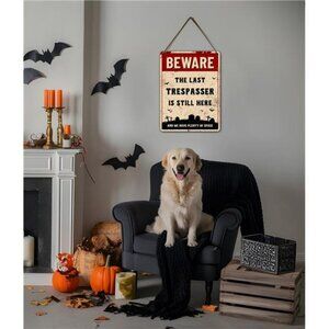 Spooky and Humorous Halloween Sign: Elevate your Halloween signs decor with this funny and creepy aluminum sign "Beware The Last Trespasser is Still Here, and We Have Plenty of Space". Perfect for halloween fence decorations, cemerty, halloween graveyard decorations. This sign will add a unique touch to your Halloween props and town decorations.