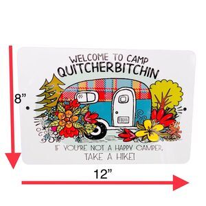 Add some laughs to your campsite or RV with this funny tin sign featuring the phrase "Welcome to Our Camper Quitcherbitchen." Perfect for outdoor enthusiasts with a sense of humor, this metal sign is great for trailers, cabins, man caves, or she sheds. Made from durable tin with pre-drilled holes for easy hanging. Lightweight but sturdy, it’s designed for indoor or covered outdoor use. The retro-inspired print adds charm while reminding guests to relax and enjoy the ride. Sign measures approximately 8" x 12". Condition is new but may have minor surface wear due to storing over time. No major dents or damage. Please review all photos for details. A fun gift idea for campers, RV owners, or anyone who appreciates a good joke.
