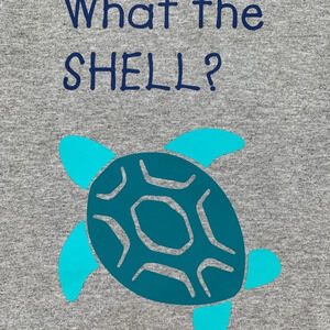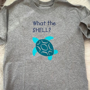Made in my shop Lotus Gifts & Creations! Gray t-shirt with “What the SHELL?” and a two-tone turtle. Colors can be customized.
