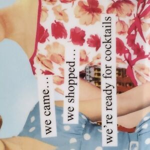 Features the saying "we came; We shopped; We're ready for cocktails"