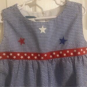Adorable blue and white gingham sleeveless romper with red ribbon accents