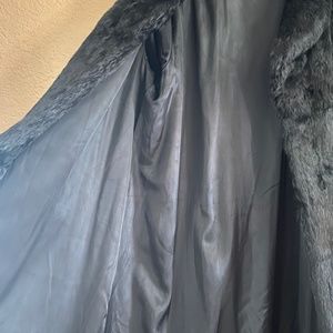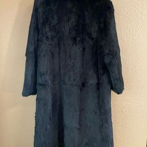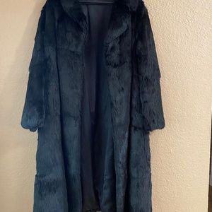 Black Full length Rabbit Fur coat. My mom gave this to me years ago and it has been hanging in my air conditioned closet getting no use as I live in Florida. This is at least an XL size. Pit to pit measures 26”, collar to bottom is 48”. Weighs 5lbs. Beautiful soft Fur coat with hook front closures and hidden loops on sides if you choose to belt it. Belt not included.