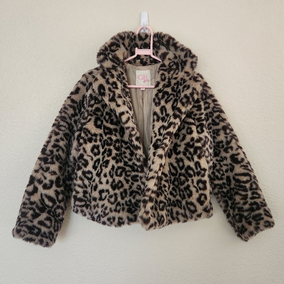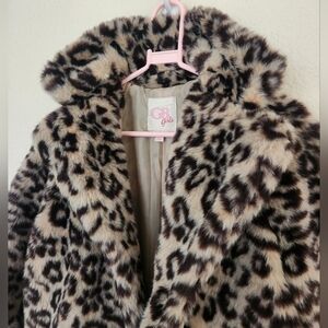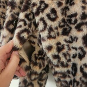 This stylish faux fur jacket features a chic leopard print design. Perfect for adding a touch of wild elegance to any outfit with pockets and button closure