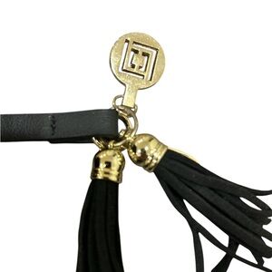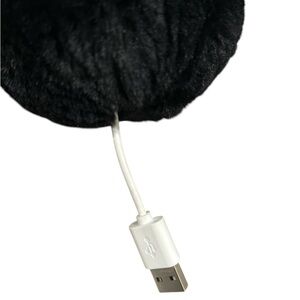 Elegant black fur pom pom keychain with stylish gold accents and Cell Phone Charger. A touch of luxury and function.