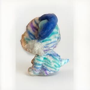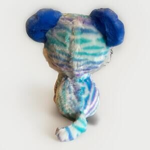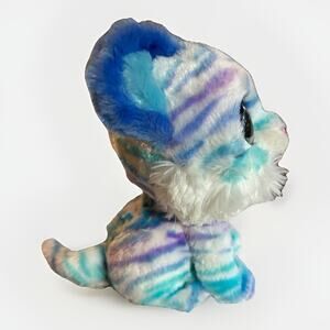 Design: Features soft, colorful fur with blue, purple, and white stripes.