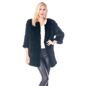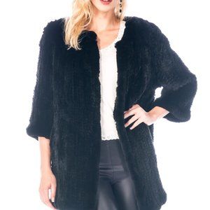 Black Fur Cardigan Sweater Contents: Black Dyed Sheared Knitted Rex Rabbit. Length: 29" . Side Seam Pockets. Hook and Eye closures. Fur Origin: China.