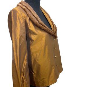 Fur Trimmed Taffeta Blouse 90s Y2K Dark Gold V-Neckline Button Front