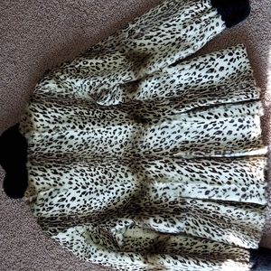 Excellent condition. Beautiful stenciled kidskin (goat) with Rex rabbit collar and cuffs. The collar, buttons, cuffs and lining are black. The body is cream with brown print. Measurements = shoulder to end of cuff 24 inches, length is 27 inches, bust is 19 1/2 inches, waist is 18 inches.
