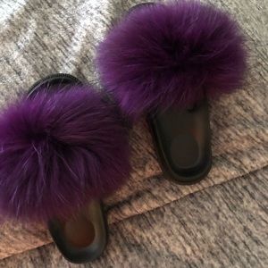 Purple Fur Slides. Size 10. Literally brand new I wore these once! These slides are super cute and go perfect with almost anything. I wear a size 9-9.5 and these fit me perfectly! Says size 10 but a small 10 I would say. No trades.