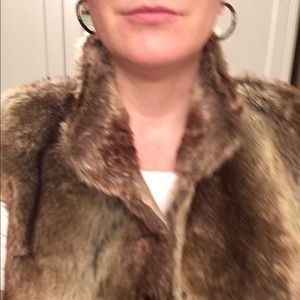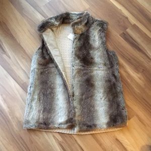 This BRAND NEW, never worn boutique faux fur vest is fun, extremely soft, and versatile. The back is an open weave knit, so you can layer this without getting too warm...cute under a denim jacket. The fur is on both sides of the collar, so you can pop the collar or fold it down. Cool brown tones ranging from oatmeal to coffee. 27.5” long, 19.5” underarm to underarm