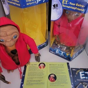 E.T. invites everyone to share the thrill of his magic touch. It's more than a movie - it's an experience you'll never forget. Just like the real E.T., this figure's heart and finger really glow. E.T. has a vocabulary of over 400 words! He has animated eyes and mouth, telescoping neck, and poseable arms! He can communicate with Furby, Furby Babies, Gizmo, Shelby and another E.T. Teach E.T. how to speak, behave and play!" Furby E.T. 2000 The Extra-Terrestrial Interactive E.T. heart & finger glow Rare.Excellent condition.Looks new.He ships fast.Arrives In Original box with original instructions booklet