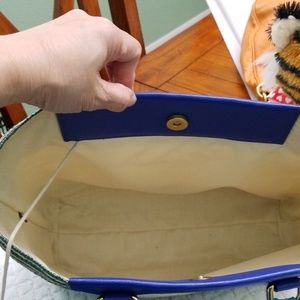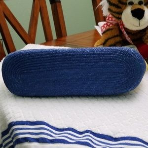 A unique straw fabric with rubber handle. Exterior looks very nice, interior is clean, normal sign of use. Pouch with string attached on the inside. Comes with dust bag.This cute bag is perfect for the summer. Overall, its in perfect condition.