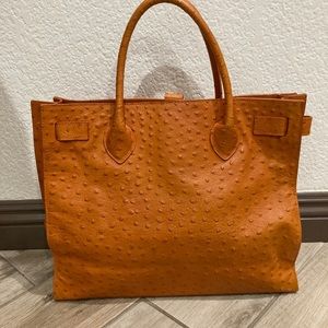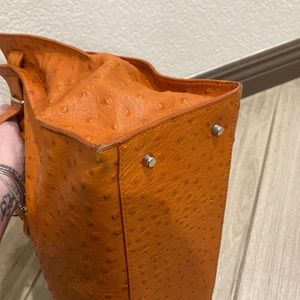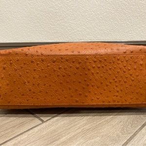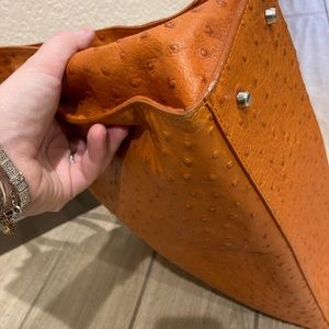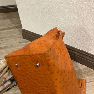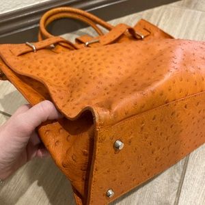 Furla bag in orange leather with ostrich texture (bag comes with dust cover). The overall condition of the bag is in great shape. You can see some wear on the corners as shown in the pictures. There is also a mark on the front strap of the bag by the ‘buckle’ as shown in the pictures. Inside of the bag is clean and mark free.
